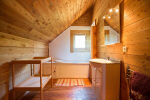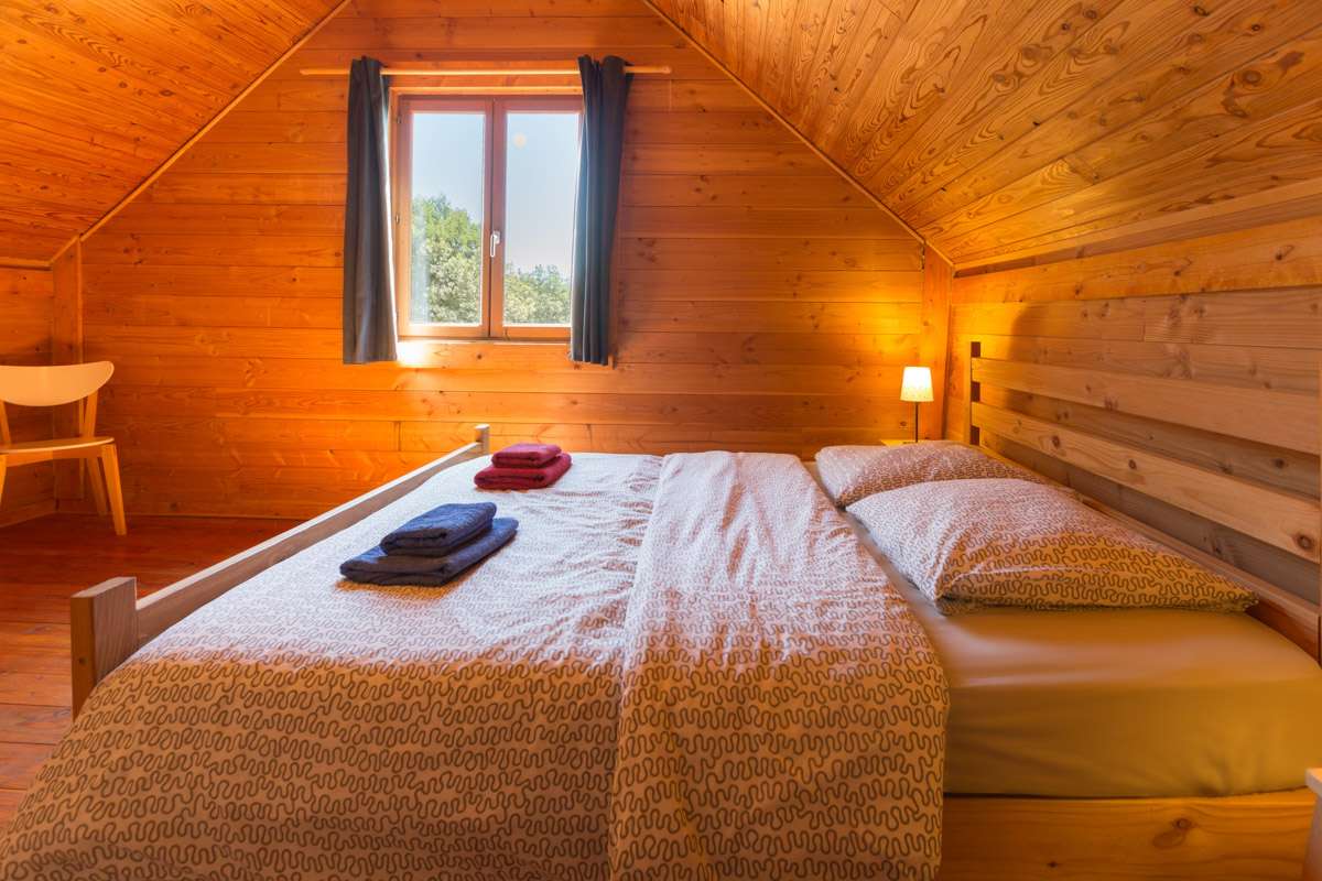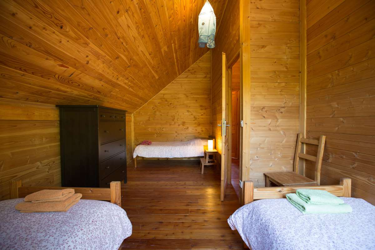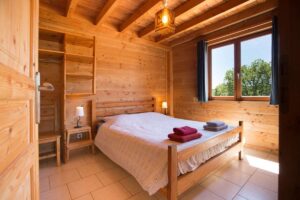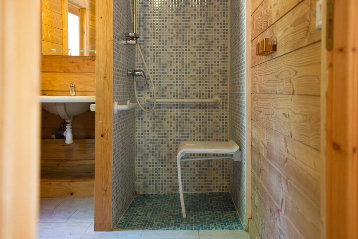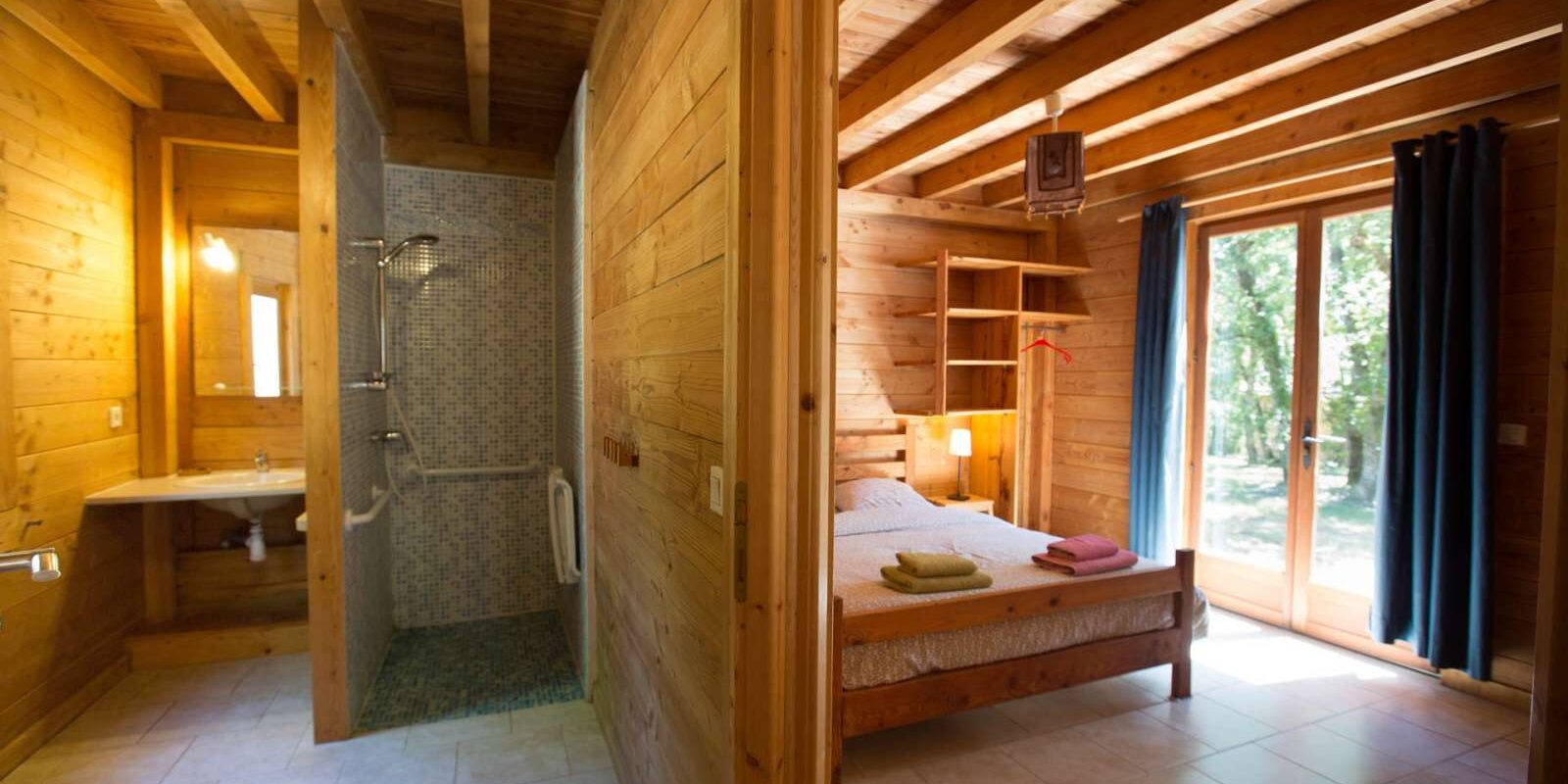 Chalet écologique trois chambres (6/9 pers.), aménagé pour l’accueil des personnes à mobilité réduite. Il ressemble aux autres chalets trois chambres, mais on a fait quelques adaptations :